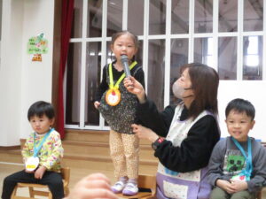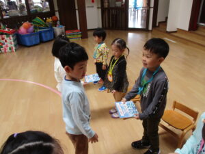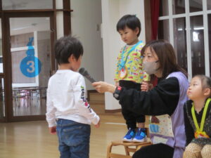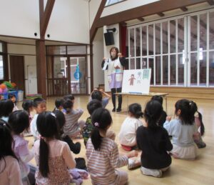 先生からのお楽しみ、3歳以上児は「ねこのお医者さん」のミュージックパネルシアターを見ました。「ねこねこねこのお医者さーん」と音楽に合わせて歌いながら聞きました。未満児は、「だるまさんが」のペープサートでした。大好きなだるまさんシリーズの絵本。だるまさんと一緒に「だるまさんがどてっ」「ぷっ」「にこっ」と真似をして身体を動かしながら楽しんで見ていました。