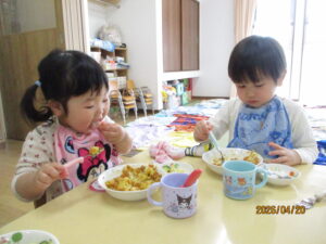 パクパク、もりもりお友達と一緒にたくさん食べました。